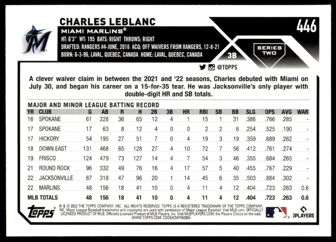 This BaseballΒ card, from 2023 is part of the Topps Series 2Β card set. Charles Leblanc is featured and has a card number of 446.