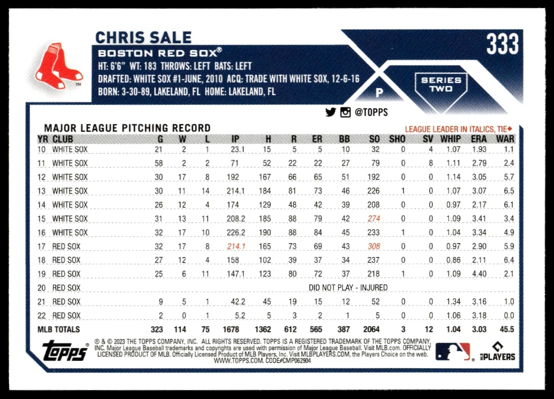 This Baseball card, from 2023 is part of the Topps Series 2 card set. Chris Sale is featured and has a card number of 333.