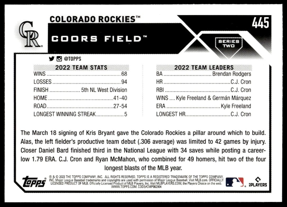 Home Β» 2023 Topps Series 2 Colorado Rockies #445