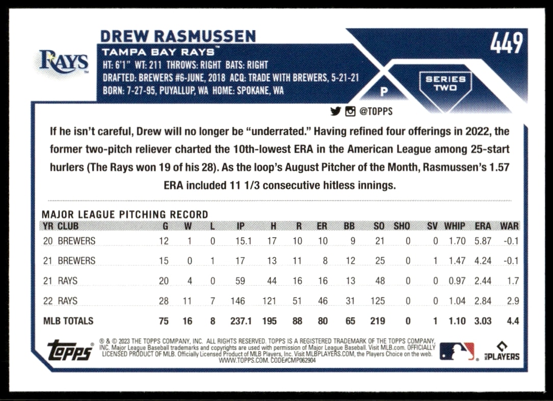 This BaseballΒ card, from 2023 is part of the Topps Series 2Β card set. Drew Rasmussen is featured and has a card number of 449.