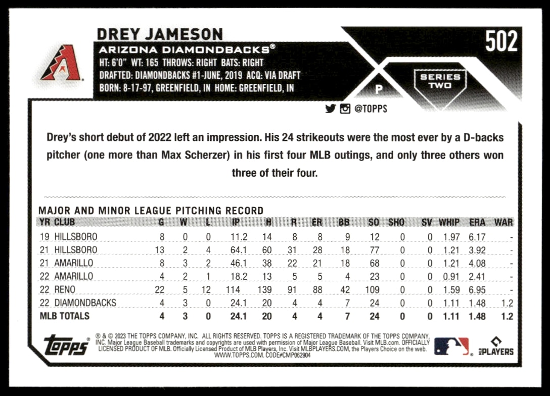 This Baseball card, from 2023 is part of the Topps Series 2 card set. Drey Jameson is featured and has a card number of 502.