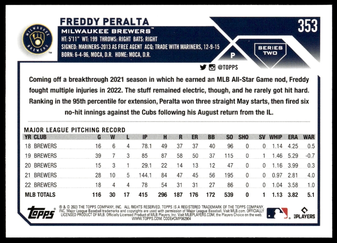 This BaseballΒ card, from 2023 is part of the Topps Series 2Β card set. Freddy Peralta is featured and has a card number of 353.