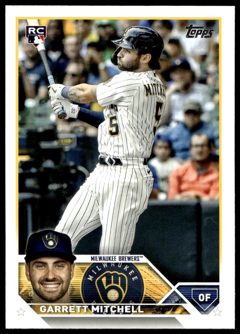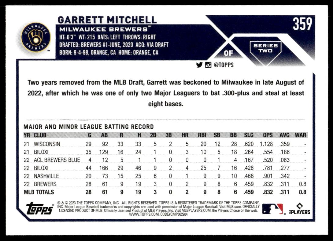 This BaseballΒ card, from 2023 is part of the Topps Series 2Β card set. Garrett Mitchell is featured and has a card number of 359.
