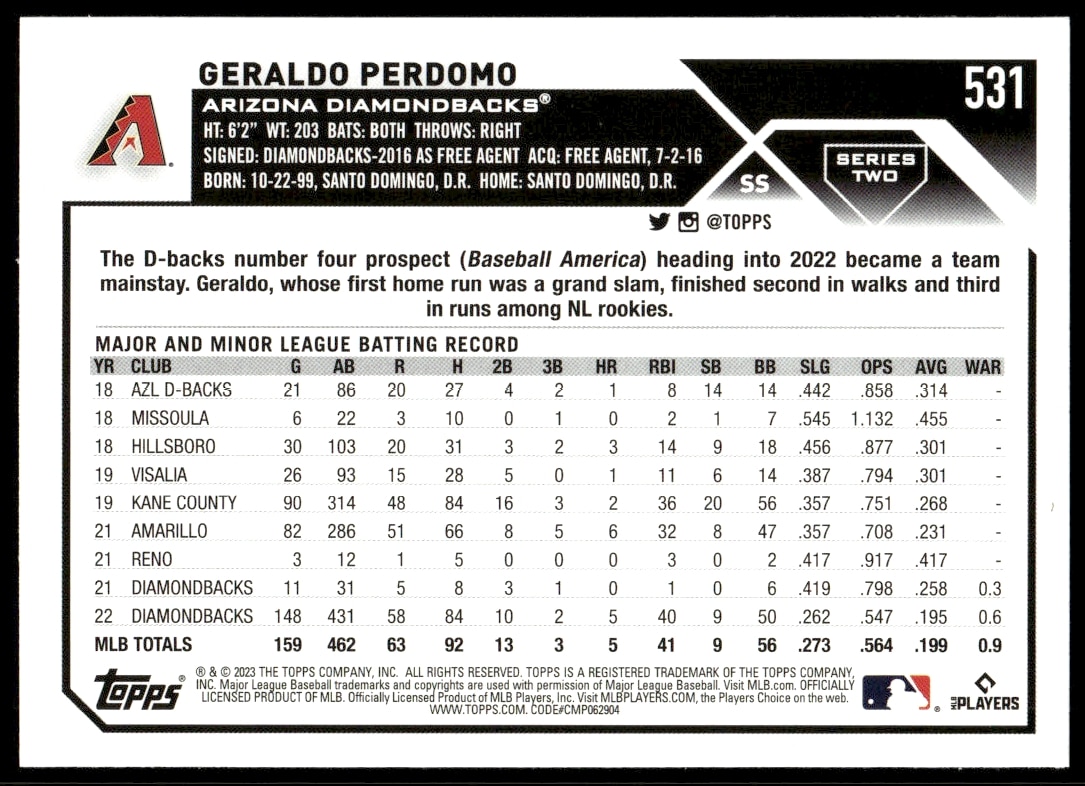 This Baseball card, from 2023 is part of the Topps Series 2 card set. Geraldo Perdomo is featured and has a card number of 531.