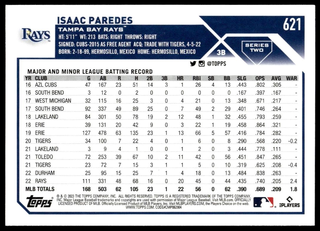 This BaseballΒ card, from 2023 is part of the Topps Series 2Β card set. Isaac Paredes is featured and has a card number of 621.