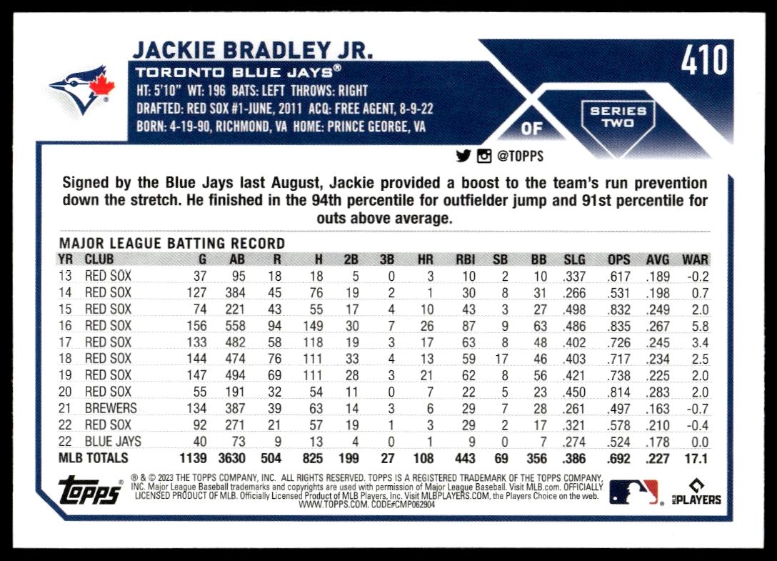 This Baseball card, from 2023 is part of the Topps Series 2 card set. Jackie Bradley Jr. is featured and has a card number of 410.