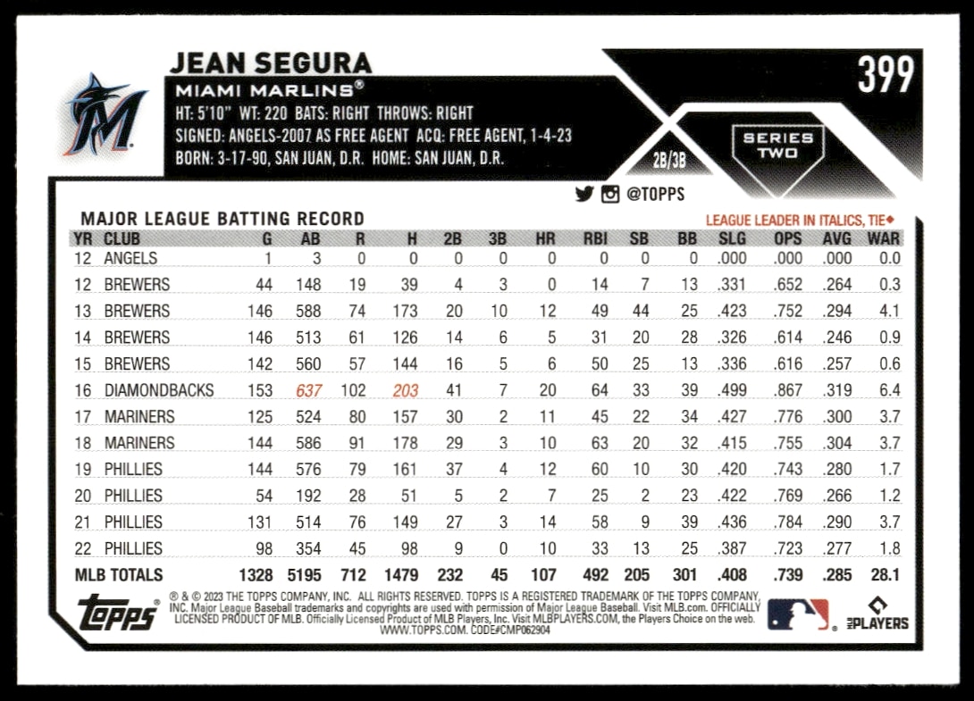 This Baseball card, from 2023 is part of the Topps Series 2 card set. Jean Segura is featured and has a card number of 399.