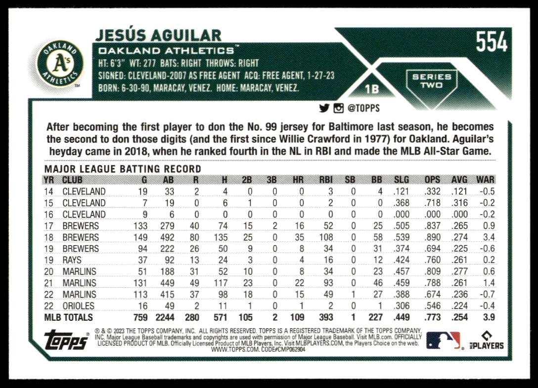 This BaseballΒ card, from 2023 is part of the Topps Series 2Β card set. Jesus Aguilar is featured and has a card number of 554.