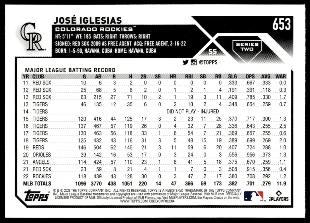 This Baseball card, from 2023 is part of the Topps Series 2 card set. Jose Iglesias is featured and has a card number of 653.