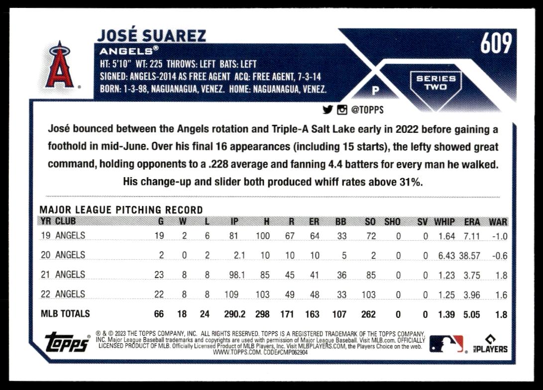 This Baseball card, from 2023 is part of the Topps Series 2 card set. Jose Suarez is featured and has a card number of 609.