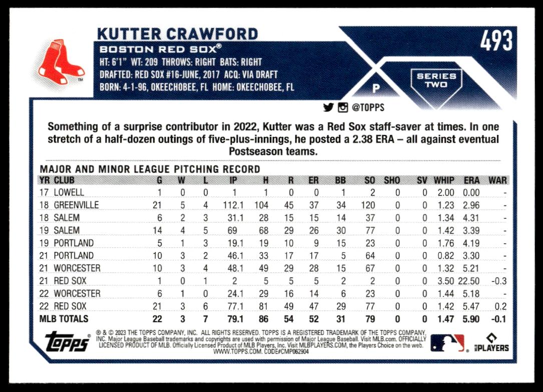 This Baseball card, from 2023 is part of the Topps Series 2 card set. Kutter Crawford is featured and has a card number of 493.