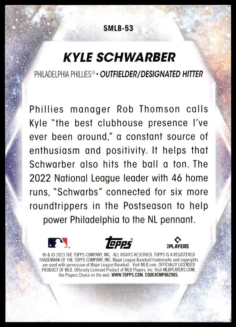 This BaseballΒ card, from 2023 is part of the Topps Series 2Β card set. Kyle Schwarber is featured and has a card number of SMLB-53.