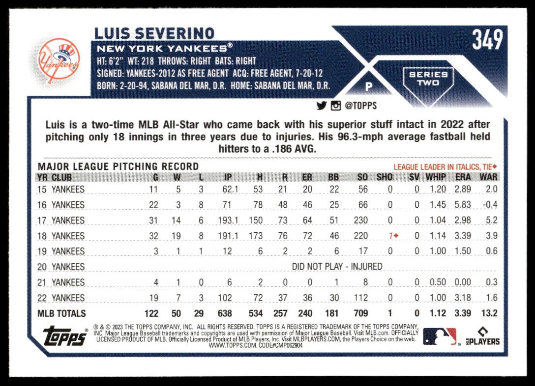This BaseballΒ card, from 2023 is part of the Topps Series 2Β card set. Luis Severino is featured and has a card number of 349.