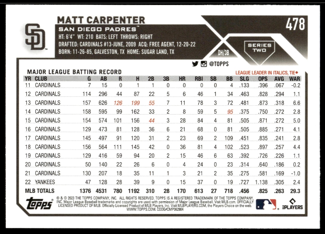 This BaseballΒ card, from 2023 is part of the Topps Series 2Β card set. Matt Carpenter is featured and has a card number of 478.