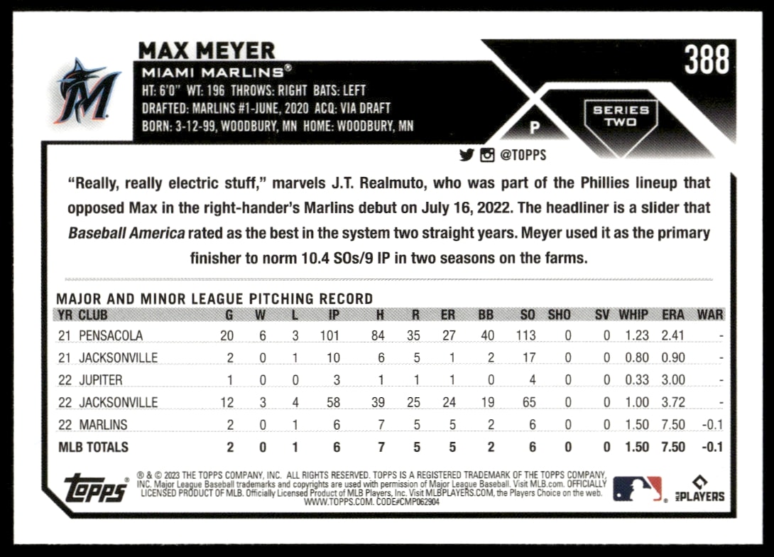 This BaseballΒ card, from 2023 is part of the Topps Series 2Β card set. Max Meyer is featured and has a card number of 388.