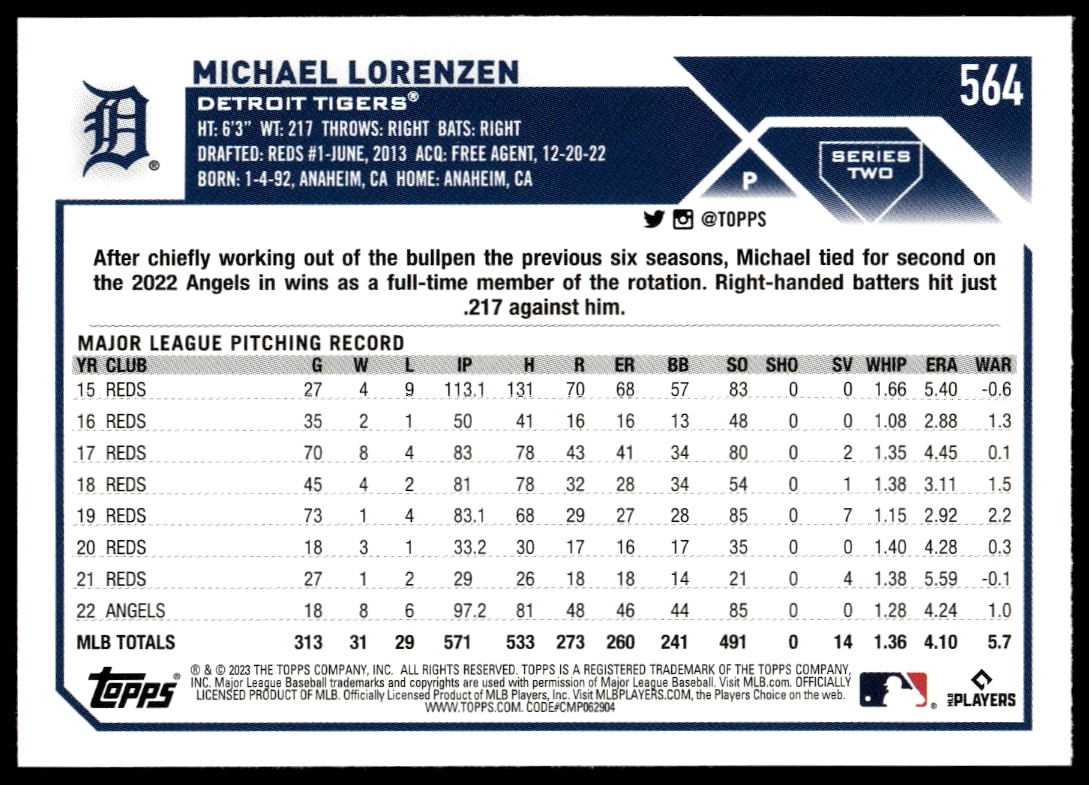 This BaseballΒ card, from 2023 is part of the Topps Series 2Β card set. Michael Lorenzen is featured and has a card number of 564.