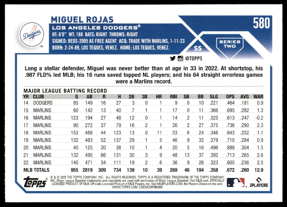This BaseballΒ card, from 2023 is part of the Topps Series 2Β card set. Miguel Rojas is featured and has a card number of 580.