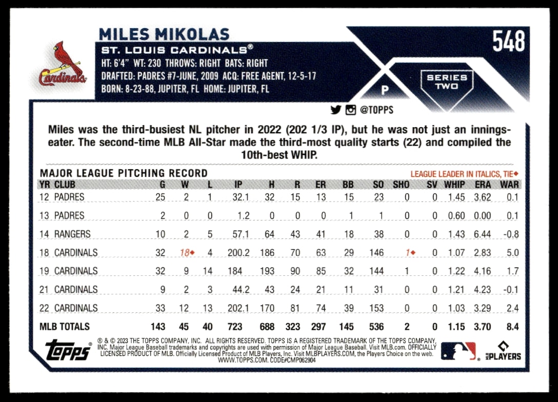 This BaseballΒ card, from 2023 is part of the Topps Series 2Β card set. Miles Mikolas is featured and has a card number of 548.