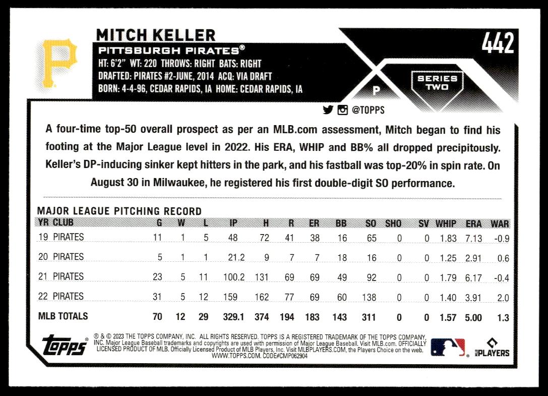 This Baseball card, from 2023 is part of the Topps Series 2 card set. Mitch Keller is featured and has a card number of 442.