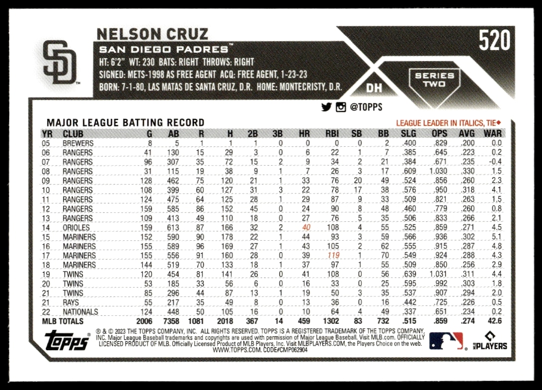 This BaseballΒ card, from 2023 is part of the Topps Series 2Β card set. Nelson Cruz is featured and has a card number of 520.
