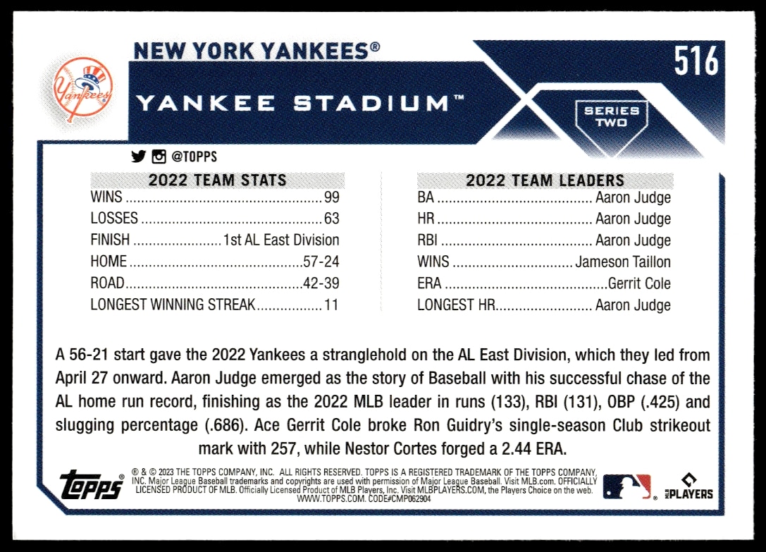 This Baseball card, from 2023 is part of the Topps Series 2 card set. New York Yankees is featured and has a card number of 516.