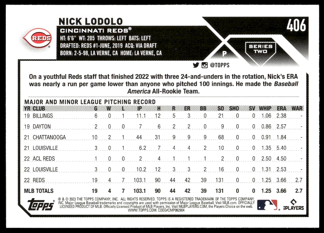 This BaseballΒ card, from 2023 is part of the Topps Series 2Β card set. Nick Lodolo is featured and has a card number of 406.