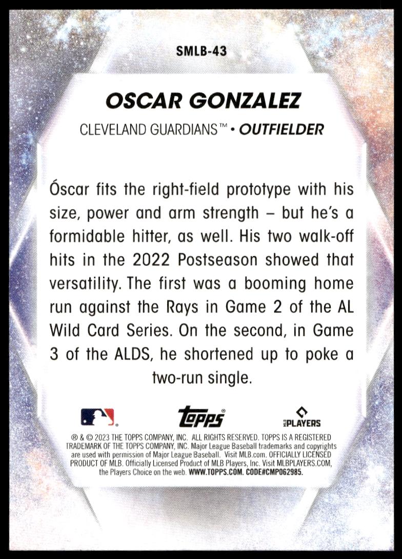 This Baseball card, from 2023 is part of the Topps Series 2 card set. Óscar González is featured and has a card number of SMLBC-43.
