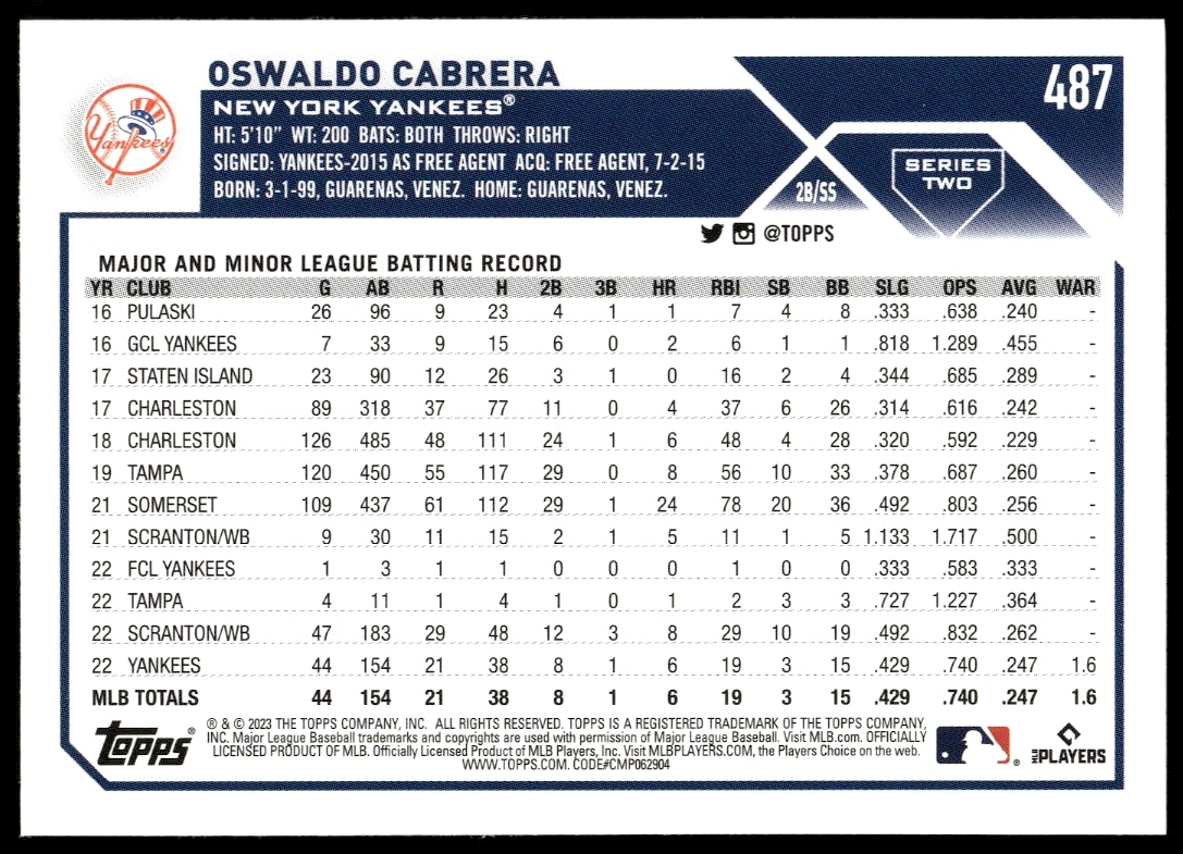 This Baseball card, from 2023 is part of the Topps Series 2 card set. Oswaldo Cabrera is featured and has a card number of 487.