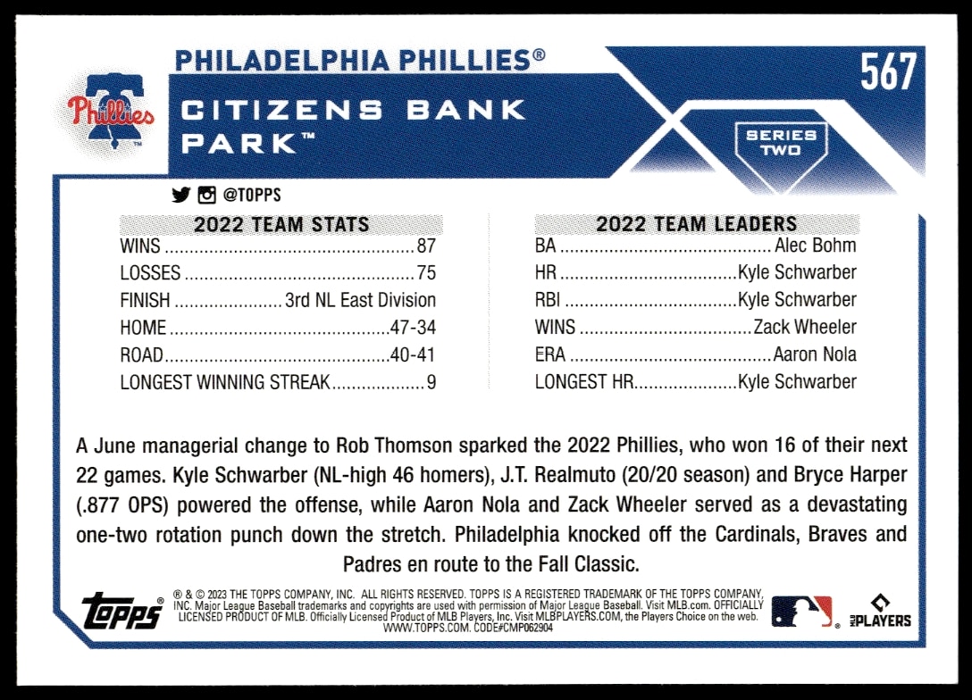 This Baseball card, from 2023 is part of the Topps Series 2 card set. Philadelphia Phillies is featured and has a card number of 567.