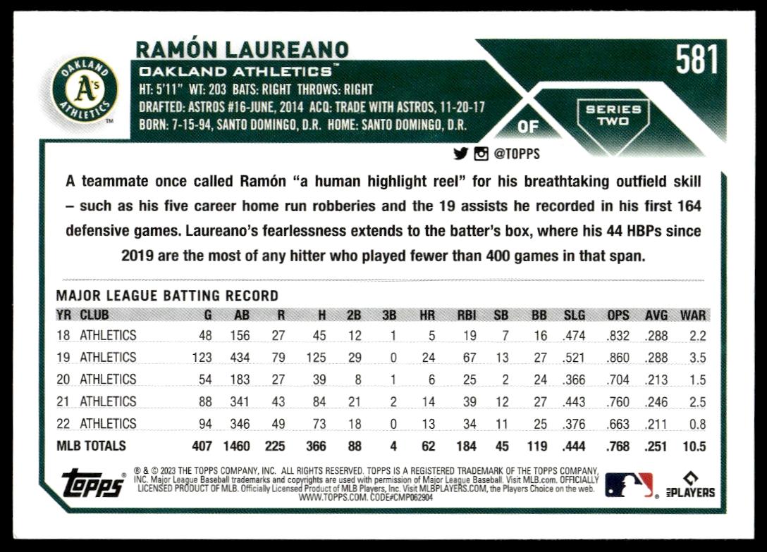 This Baseball card, from 2023 is part of the Topps Series 2 card set. Ramón Laureano is featured and has a card number of 581.