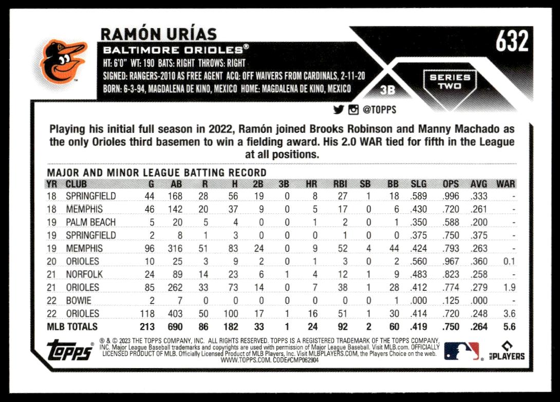 This Baseball聽card, from 2023 is part of the Topps Series 2聽card set. Ram贸n Ur铆as is featured and has a card number of 632.