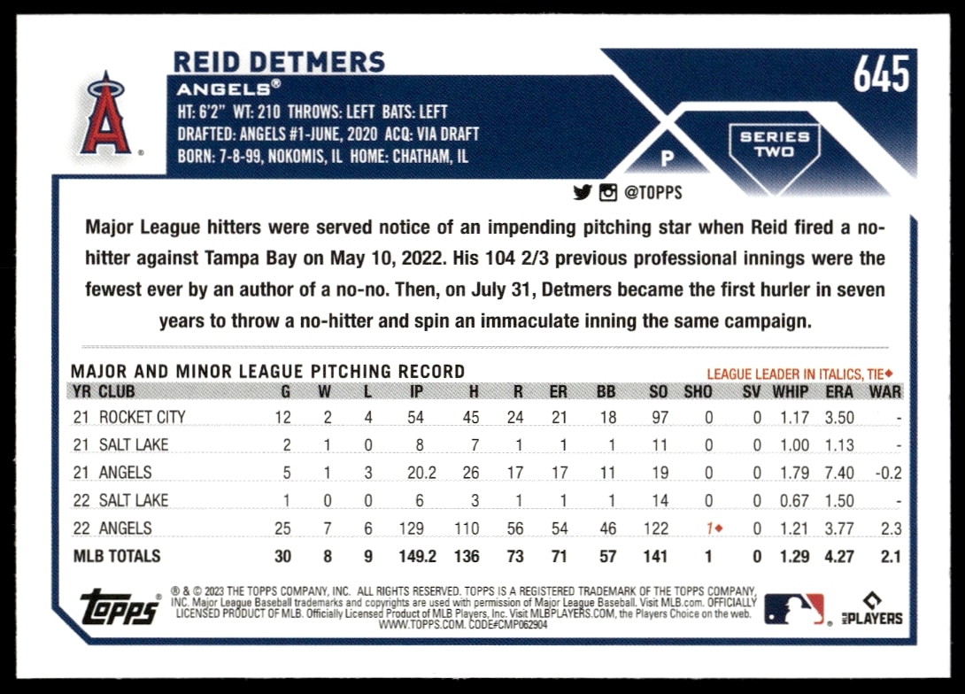 This BaseballΒ card, from 2023 is part of the Topps Series 2Β card set. Reid Detmers is featured and has a card number of 645.