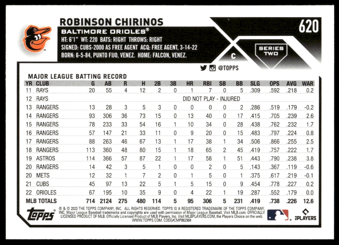 This BaseballΒ card, from 2023 is part of the Topps Series 2Β card set. Robinson Chirinos is featured and has a card number of 620.