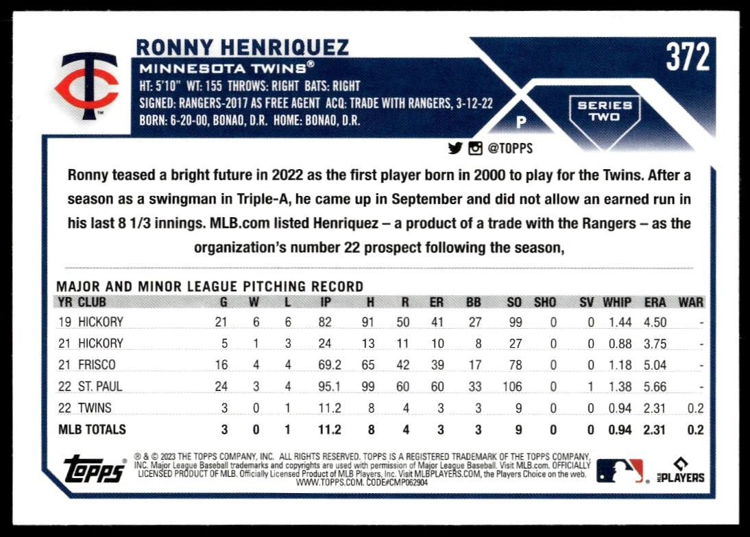 This Baseball card, from 2023 is part of the Topps Series 2 card set. Ronny Henriquez is featured and has a card number of 372.