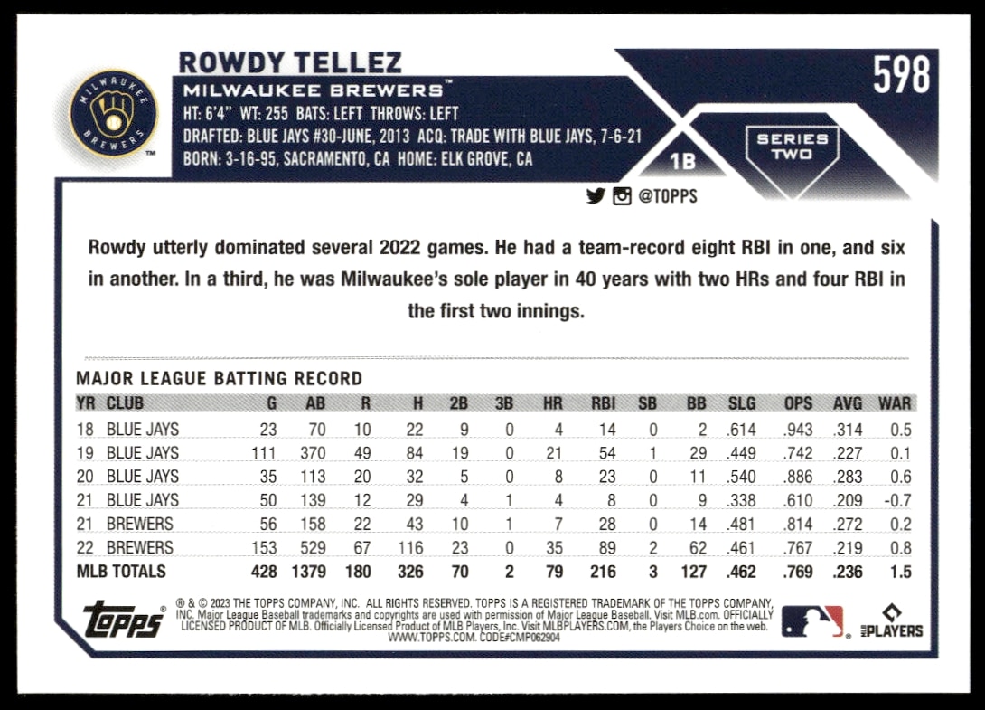 This BaseballΒ card, from 2023 is part of the Topps Series 2Β card set. Rowdy Tellez is featured and has a card number of 598.