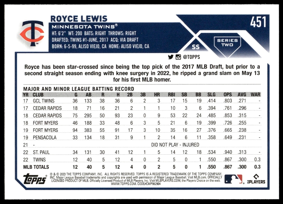 This BaseballΒ card, from 2023 is part of the Topps Series 2Β card set. Royce Lewis is featured and has a card number of 451.