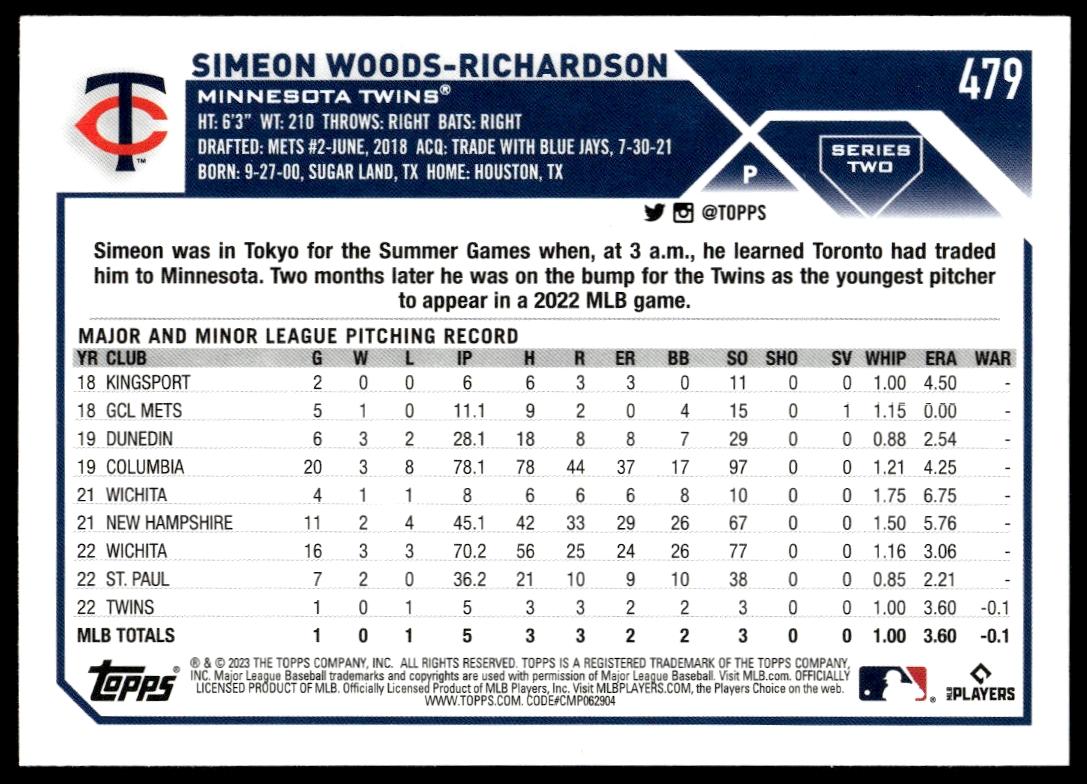 This Baseball card, from 2023 is part of the Topps Series 2 card set. Simeon Woods Richardson is featured and has a card number of 479.
