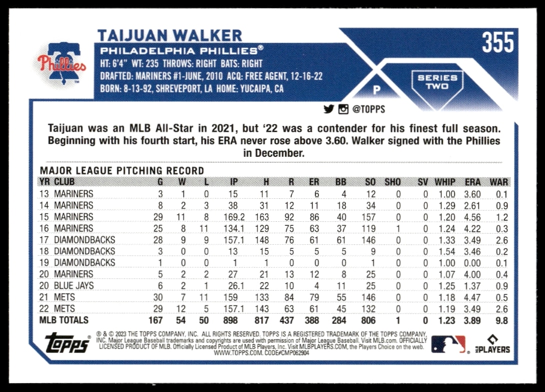 This BaseballΒ card, from 2023 is part of the Topps Series 2Β card set. Taijuan Walker is featured and has a card number of 355.