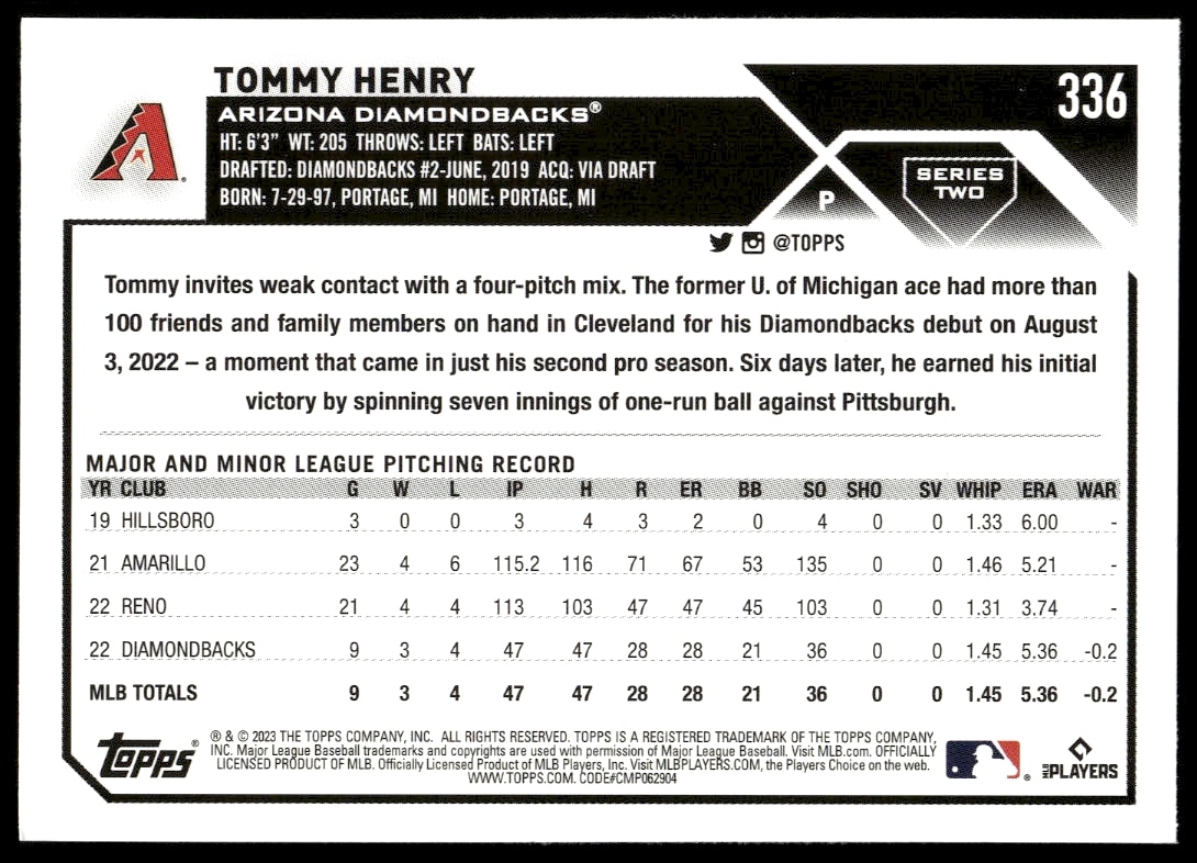 This Baseball card, from 2023 is part of the Topps Series 2 card set. Tommy Henry is featured and has a card number of 336.