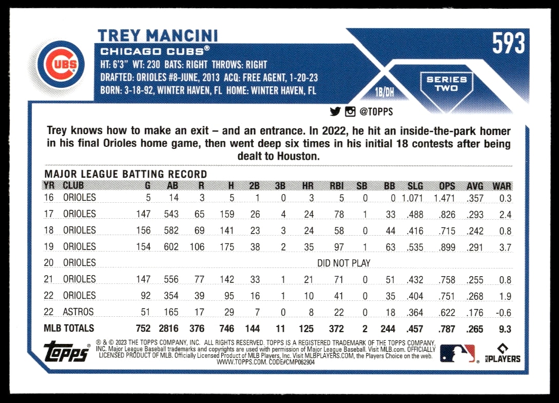 This BaseballΒ card, from 2023 is part of the Topps Series 2Β card set. Trey Mancini is featured and has a card number of 593.