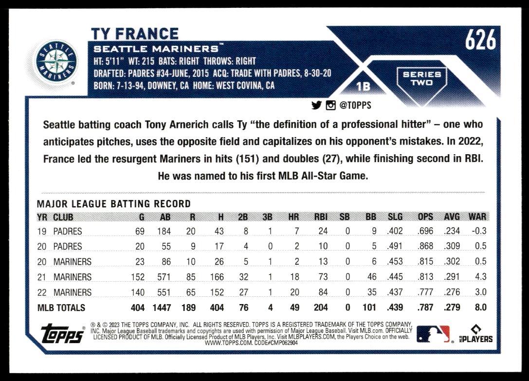 This Baseball card, from 2023 is part of the Topps Series 2 card set. Ty France is featured and has a card number of 626.