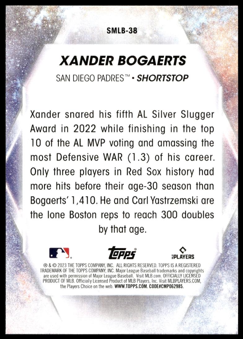 This BaseballΒ card, from 2023 is part of the Topps Series 2Β card set. Xander Bogaerts is featured and has a card number of SMLB-38.
