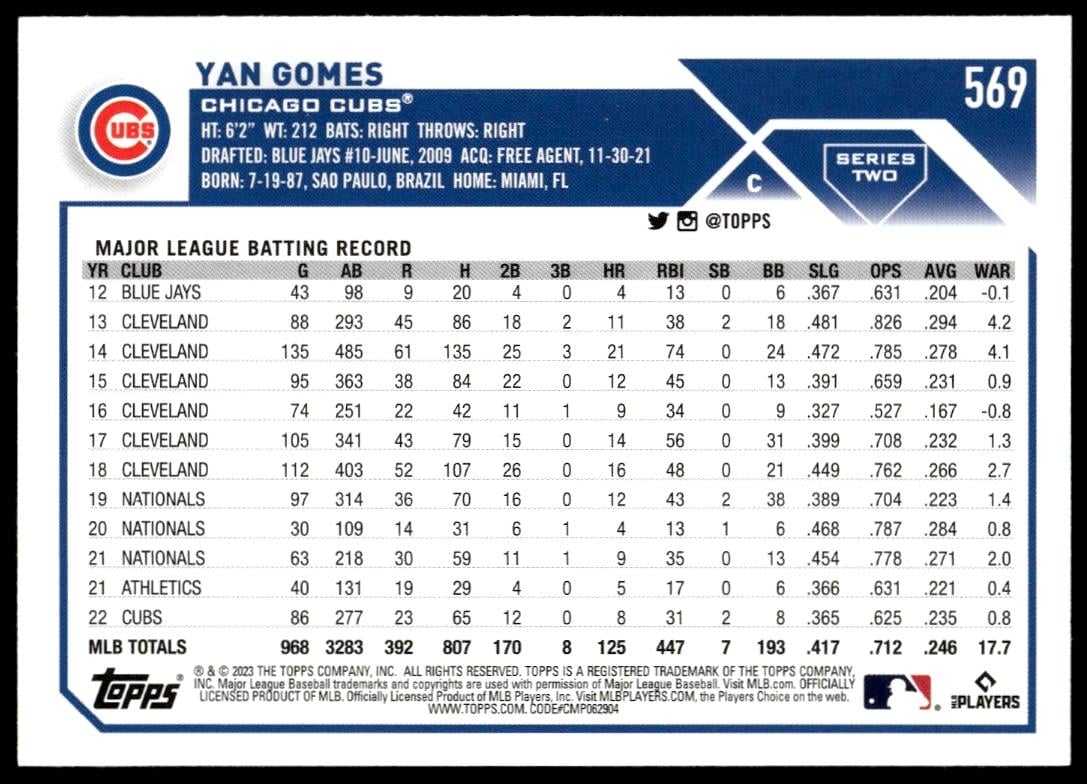 This Baseball card, from 2023 is part of the Topps Series 2 card set. Yan Gomes is featured and has a card number of 569.