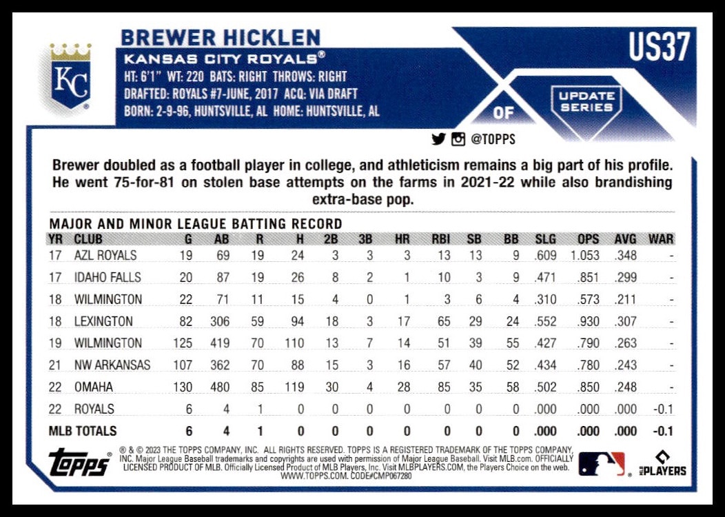 This Baseball card, from 2023 is part of the Topps Update card set. Brewer Hicklen is featured and has a card number of US37.