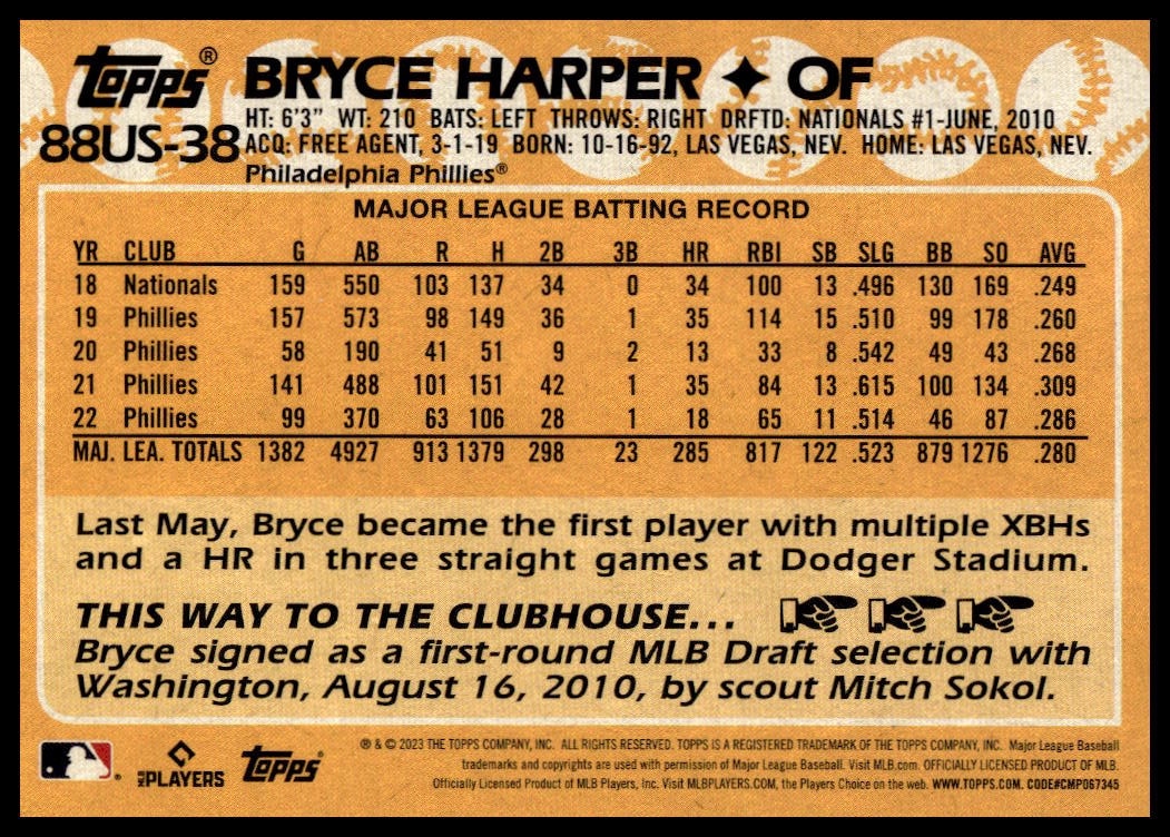 This Baseball card, from 2023 is part of the Topps Update card set. Bryce Harper is featured and has a card number of 88US-38.