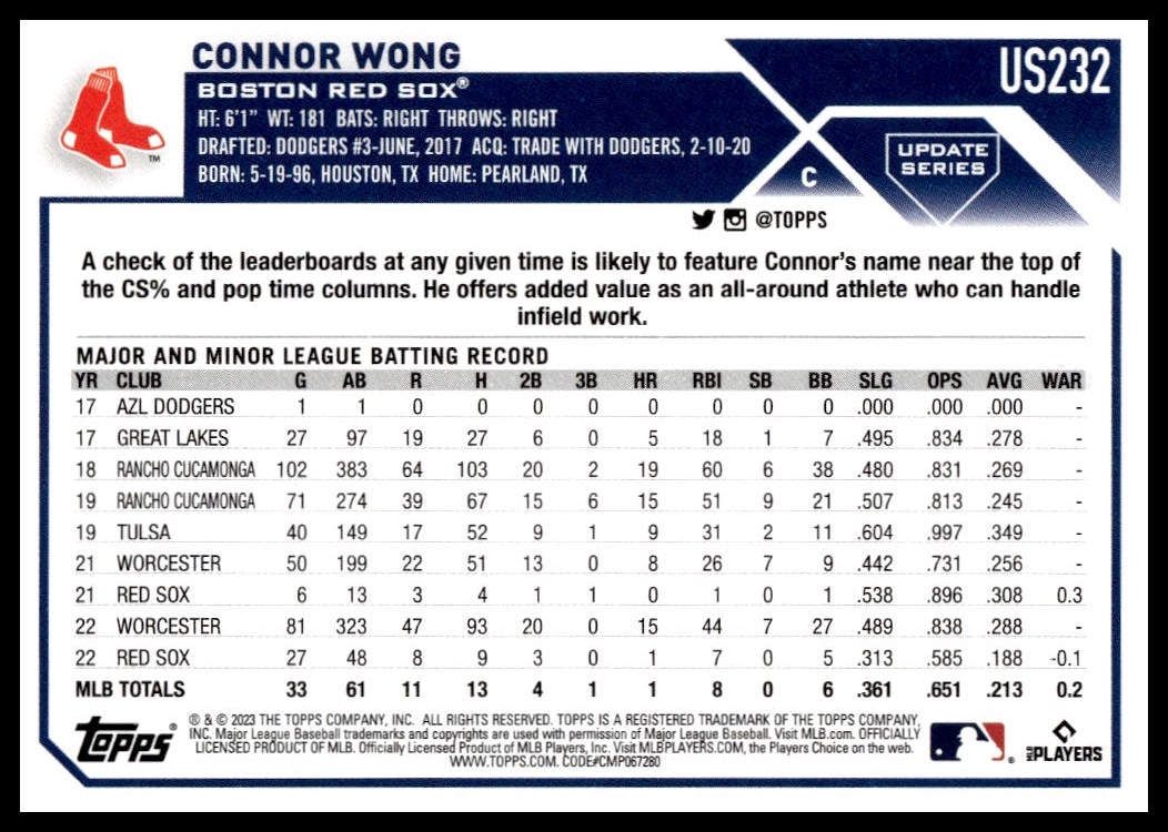 This BaseballΒ card, from 2023 is part of the Topps UpdateΒ card set. Connor Wong is featured and has a card number of US232.