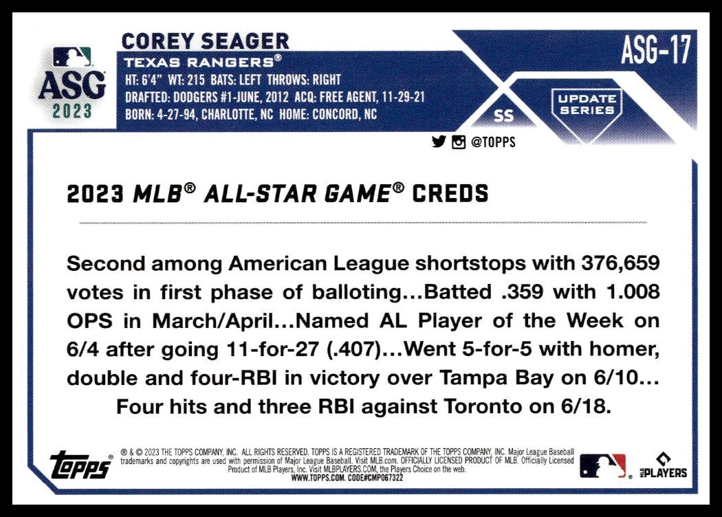 This BaseballΒ card, from 2023 is part of the Topps UpdateΒ card set. Corey Seager is featured and has a card number of ASG-17.