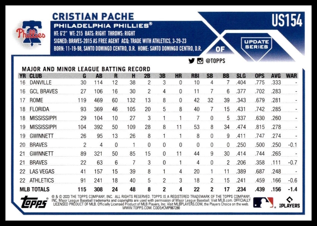This Baseball card, from 2023 is part of the Topps Update card set. Cristian Pache is featured and has a card number of US154.
