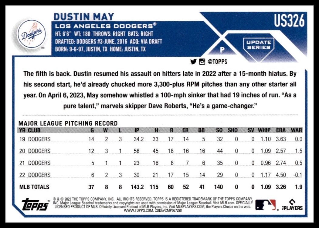 This BaseballΒ card, from 2023 is part of the Topps UpdateΒ card set. Dustin May is featured and has a card number of USC48.