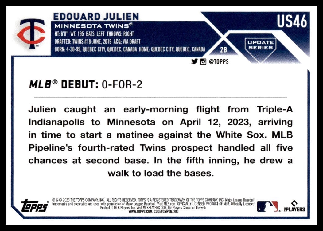 This Baseball card, from 2023 is part of the Topps Update card set. Edouard Julien is featured and has a card number of US46.